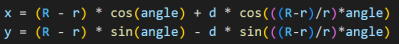 R — радиус внешней окружности; r — радиус внутренней окружности; d — расстояние от рисующей точки до центра внешней окружности; angle — угол, который с каждым выполнением цикла добавляет значение. При уменьшении величины угла усиливается точность рисовки фигуры.