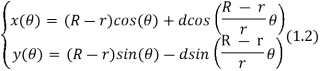 Фигуры, нарисованные спирографом, являются трохоидами, завёрнутыми или развёрнутыми в круг. Простейшая фигура (гипотрохоида), нарисована спирографом, состоящим из 2-х кругов, один с маленьким радиусом (внутри), второй с большим радиусом (снаружи). Гипотрохоида — завёрнутая в круг трохоида (рис.4). Плоская кривая задаётся параметрическим уравнением (1.2) в декартовой (прямоугольной) системе координат:
