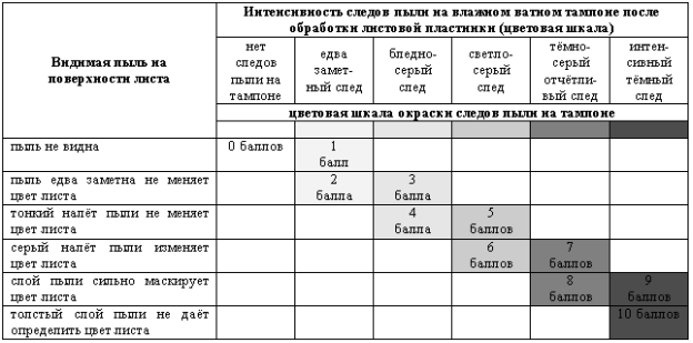 На первом этапе оценку запылённости лекарственных растений определяли по наличию и выраженности видимого налёта пыли на листьях растений и по изменению окраски поверхности влажного ватного тампона (ватная палочка) после однократного линейного соприкосновения с наружной (верхней) поверхностью листа. Для оценки степени загрязнения поверхности растений пылевыми частицами нами была разработана шкала визуальной условной оценки запылённости (шкала ВУОЗ) листьев растений, которая позволяла оценить показатель в условных единицах от 0 баллов до 10 баллов (табл.1).