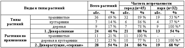 Примечание: *- р<0,05; частота встречаемости видов и типов растений (%) приведена из расчёта к общему количеству данного типа или вида растений.
