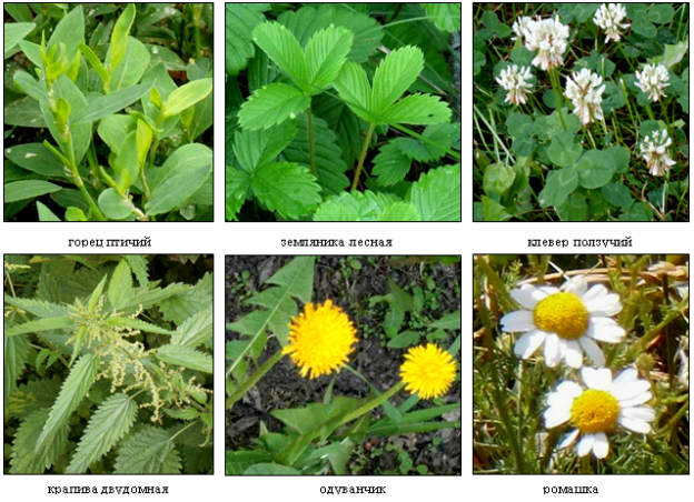 Среди этих растений бодяк полевой, вьюнок полевой, герань луговая, горец птичий, зверобой продырявленный, земляника лесная, клевер ползучий и луговой, крапива жгучая, двудомная и глухая, лапчатка гусиная, лебеда, марь, лопух, льнянка обыкновенная, одуванчик, окопник, папоротник мужской, пастушья сумка, подорожник большой и средний, полынь горькая, пырей ползучий, ромашка душистая и аптечная, синяк обыкновенный, тысячелистник и цикорий.