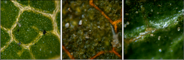 Рис. 5. Внешний вид пылевых частиц и эффект кристаллизации при микроскопии влажных отпечатков листьев