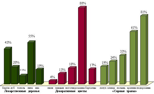 Рис. 7. Результаты анкетирования и доля известных школьникам лекарственных деревьев, декоративных цветов и сорных трав