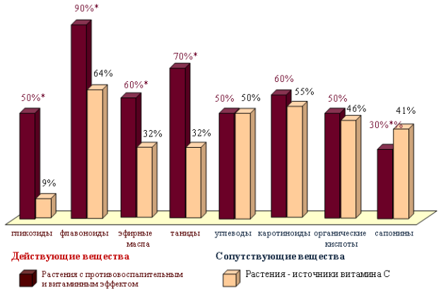 Исходя из этого, в химическом составе растений, обладающих комплексным противовоспалительным и витаминным свойством чаще всего встречаются флавоноиды (90 %), таниды (70 %), эфирные масла (60 %) и гликозиды (50 %), а также сопутствующие им каротиноиды (60 %), углеводы (50 %), органические кислоты (50 %), сапонины (41 %) и витамин С (100 %). При этом в состав «поливитаминных» растений, источников аскорбиновой кислоты, чаще всего входят действующие вещества — флавоноиды (64 %), таниды (32 %) и эфирные масла (32 %), и им сопутствуют каротиноиды (55 %), углеводы (50 %), органические кислоты (46 %) и сапонины (41 %) (рис. 2).
