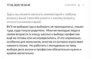 – «ВУЗ не выбирал (да и выбирать не приходилось), пошел туда, куда ткнули родители. Многие молодые люди в своем возрасте (к концу школы) к выбору профессии ещё не готовы или не определились. И это нормально, особенно для мальчиков, многие из которых взрослеют намного позже. Но работать с молодежью на тему выбора дела жизни и профессии обязательно нужно и крайне желательно».