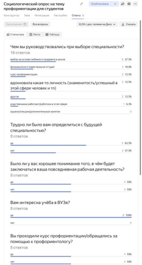 Проанализировав результаты опроса, можно сделать вывод, что студенты совершали выбор будущей специальности, основываясь на своих интересах, но испытывали трудности в принятии выбора, в том числе и по причине того, что не имели хорошего понимания того, в чём будет заключаться их повседневная рабочая деятельность.