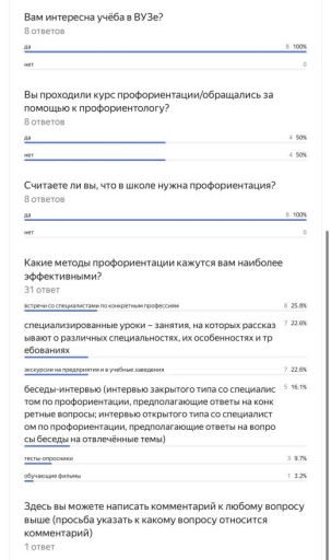 Несмотря на то, что только 50 % опрошенных обращались за помощью к профориентологу, все опрошенные считают, что профориентация в школе нужна и выбирают встречи со специалистами по конкретным профессиям, специализированные уроки, экскурсии на предприятия и в учебные заведения и беседы-интервью как наиболее эффективные методы профориентации по их мнению.