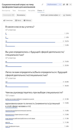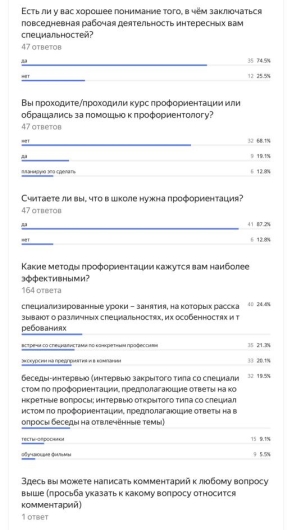 Из результатов опроса можно сделать выводы, что из-за того, что 93 % опрошенных учатся в 10 или 11 классе, то есть, находятся очень близко к моменту поступления в ВУЗ, и 75 % всех опрошенных уже определились с будущей сферой деятельности/специальностью. Следует отметить, что большая часть опрошенных испытывала сложности с выбором специальности несмотря на то, что 75 % школьников имеет хорошее представление о повседневной рабочей деятельности интересных им специальностей. По совокупности всех этих факторов, 87 % всех опрошенных считают, что профориентация в школе нужна и считают специализированные уроки, встречи со специалистами по конкретным профессиям, экскурсии на предприятия и в компании, а также беседы-интервью наиболее эффективными методами профориентации.