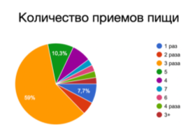 Большинство опрошенных (59 %) утверждают, что употребляют пищу три раза в день. Чуть более 10 % учеников заявляют, что едят пять раз в день, в то время как около 8 % ответов приходится на варианты «1 раз» и «4 раза». Данная информация позволяет понять предпочтения школьников в питании и является полезной для разработки рекомендаций в соответствии с рационом.
