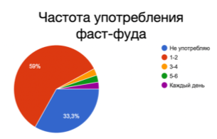 Большая часть респондентов употребляют фаст-фуд не более 2 раз в неделю, треть исследуемых употребляют его реже раза в неделю. Данные показатели свидетельствуют о значительной доле здорового питания в рационе школьников. Важно отметить, что 95 % процентов опрашиваемых не являются вегетарианцами.