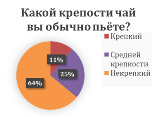 На основе диаграммы на рис. 1 можно сделать вывод, что большинство опрошенных предпочитают некрепкий чай (64 %). Средней крепости чай предпочитают 25 % респондентов, и только 11 % выбирают крепкий чай. Таким образом, некрепкий чай является самым популярным выбором среди участников опроса.