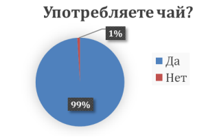 На основе второй диаграммы (рис. 2) можно сделать вывод, что подавляющее большинство опрошенных (99 %) употребляют чай. Только 1 % респондентов не пьют чай. Таким образом, чай является очень популярным напитком среди участников опроса.