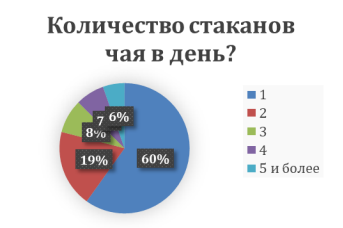 На основе третьей диаграммы (рис. 3) можно сделать вывод, что большинство опрошенных (60 %) выпивают один стакан чая в день. 19 % пьют два стакана, 8 % — три стакана, 7 % — четыре стакана, и 6 % пьют пять и более стаканов. Таким образом, один стакан чая в день является самым распространённым выбором среди участников опроса.