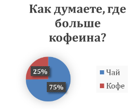 На основе рис. 4 можно сделать вывод, что большинство опрошенных (75 %) считают, что в чае больше кофеина, чем в кофе. Только 25 % полагают, что в кофе больше кофеина. Это может указывать на распространённое заблуждение среди участников опроса, так как на самом деле кофе обычно содержит больше кофеина, чем чай.