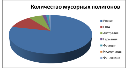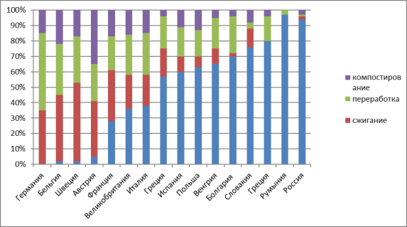 На данной гисторамме наглядно видно, что в сравнении с некоторыми европейскими странами по количеству полигонов в процентном соотношении, Россия незначительно уступает лидирующую позицию только Румынии. Это говорит о значительном преобладании в России полигонов по сравнению с другими способами утилизации отходов.