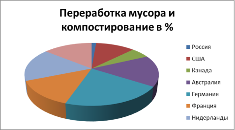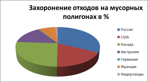 На данных диаграммах наглядно изображено в процентном соотношении какие страны больше всего используют мусорные полигоны, а какие переработку отходов. Лидерами по захоронению отходов на полигонах являются Россия, США и Канада. А лидерами по переработке отходов являются Германия, Австралия, Франция и Нидерланды.