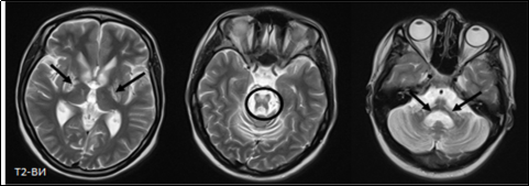 Еще одно заболевание, рассматриваемое нами в исследовании, — это болезнь Вильсона — Коновалова, вызванная мутациями в генах ATP7B [10]. Гепатолентикулярная дегенерация (или болезнь Вильсона — Коновалова) — орфанное аутосомно-рецессивное наследственное заболевание метаболизма меди с глобальной распространенностью около 1/100 000–3/100 000 населения, проявляющееся преимущественно печеночными, неврологическими и психиатрическими нарушениями вследствие чрезмерного отложения меди в органах и тканях [14]. На рисунке 3 представлены изменения на МРТ головного мозга у пациента с БВК: симметричное повышение интенсивности МР-сигнала от подкорковых структур, среднего мозга, с выраженной атрофией ствола мозга, средних мозжечковых ножек и полушарий мозжечка; признаки вторичной дегенерации мосто-мозжечковых путей в варолиевом мосту (симптом «креста»).